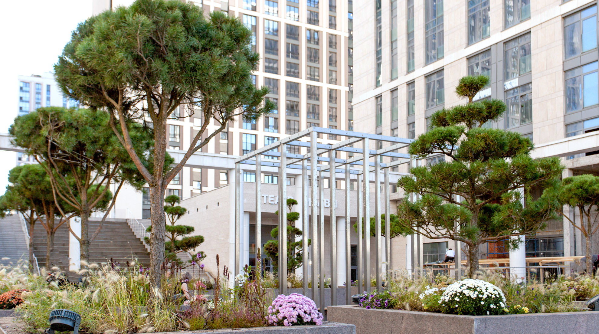 Общественные пространства жилого комплекса — особая обособленная среда. Здесь разместятся зоны отдыха и променад. Двор поднят на 9,7 метров от уровня земли. Резиденты ЖК «Дефанс Премиум» смогут попасть сюда по широкой парадной лестнице с пятью фонтанами. На первом этаже здания разместились торговая галерея‐пассаж, ресторан и театр на 500 мест с передовым кинооборудованием.