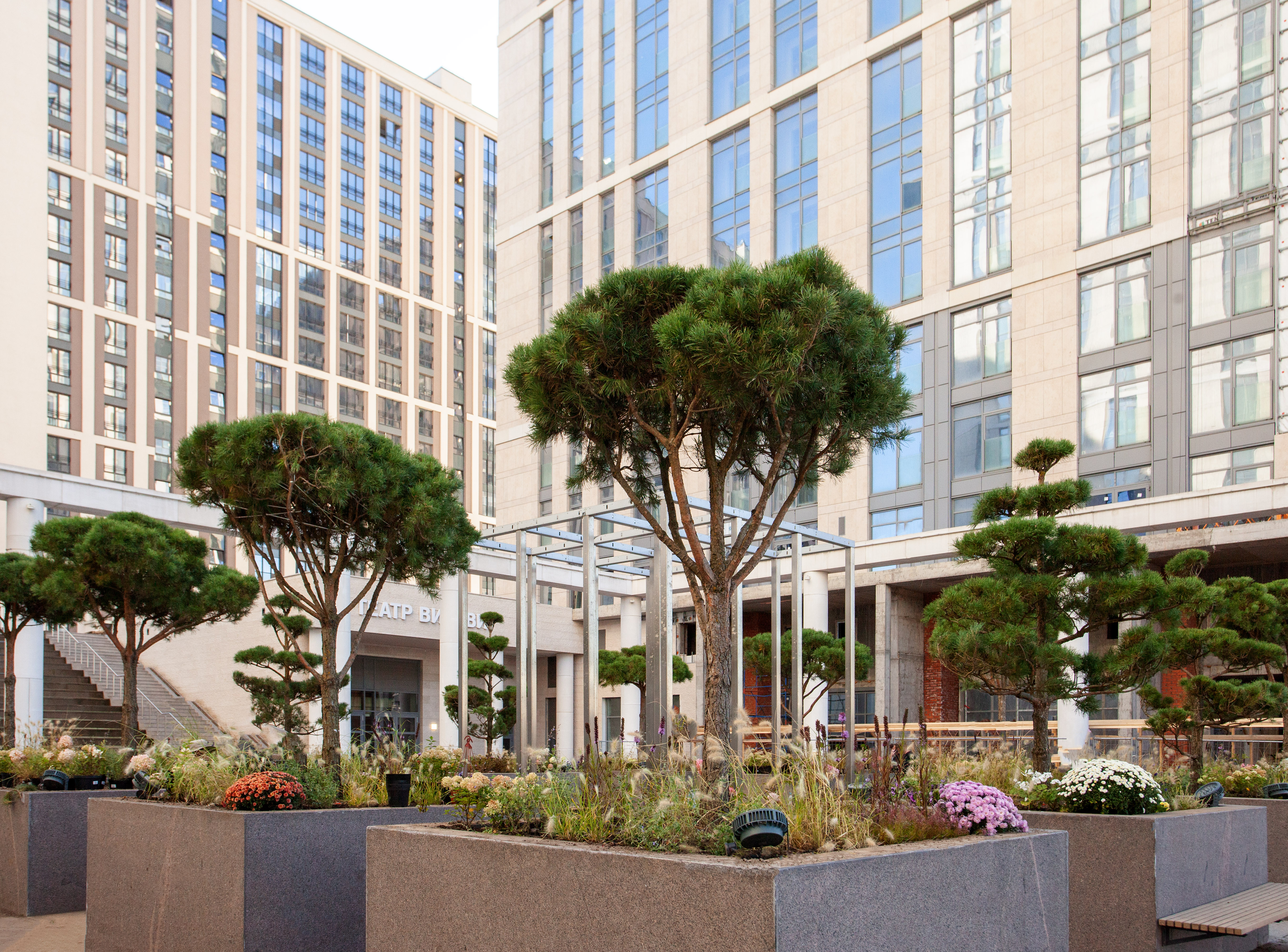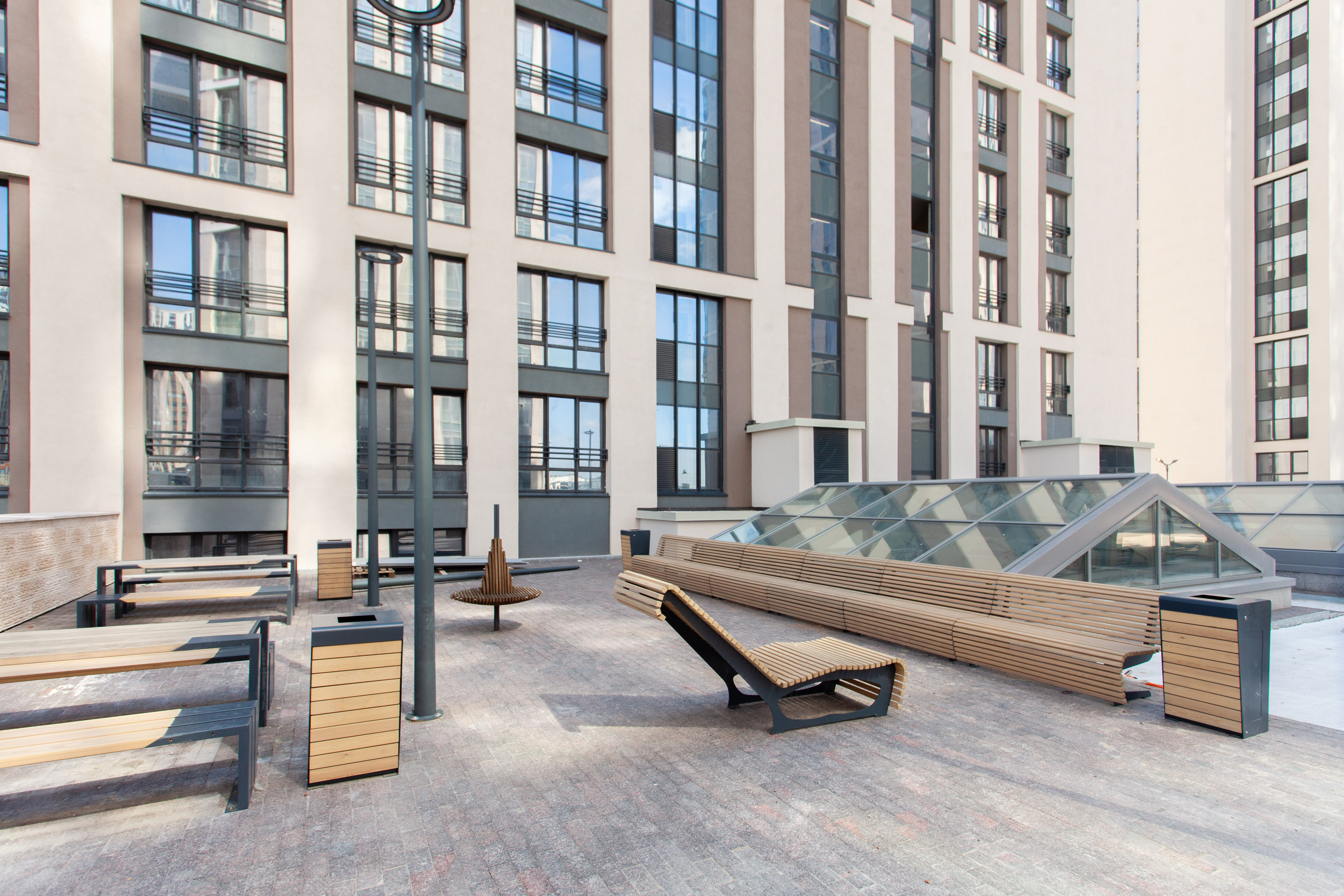 Исключительная приватность — важная составляющая проекта. Внутренние пространства комплекса закрыты от уличного шума, посторонних и машин. Местом притяжения жителей станет площадка‐амфитеатр с полупрозрачным навесом, выполненным по мотивам французской арки Le Defense.