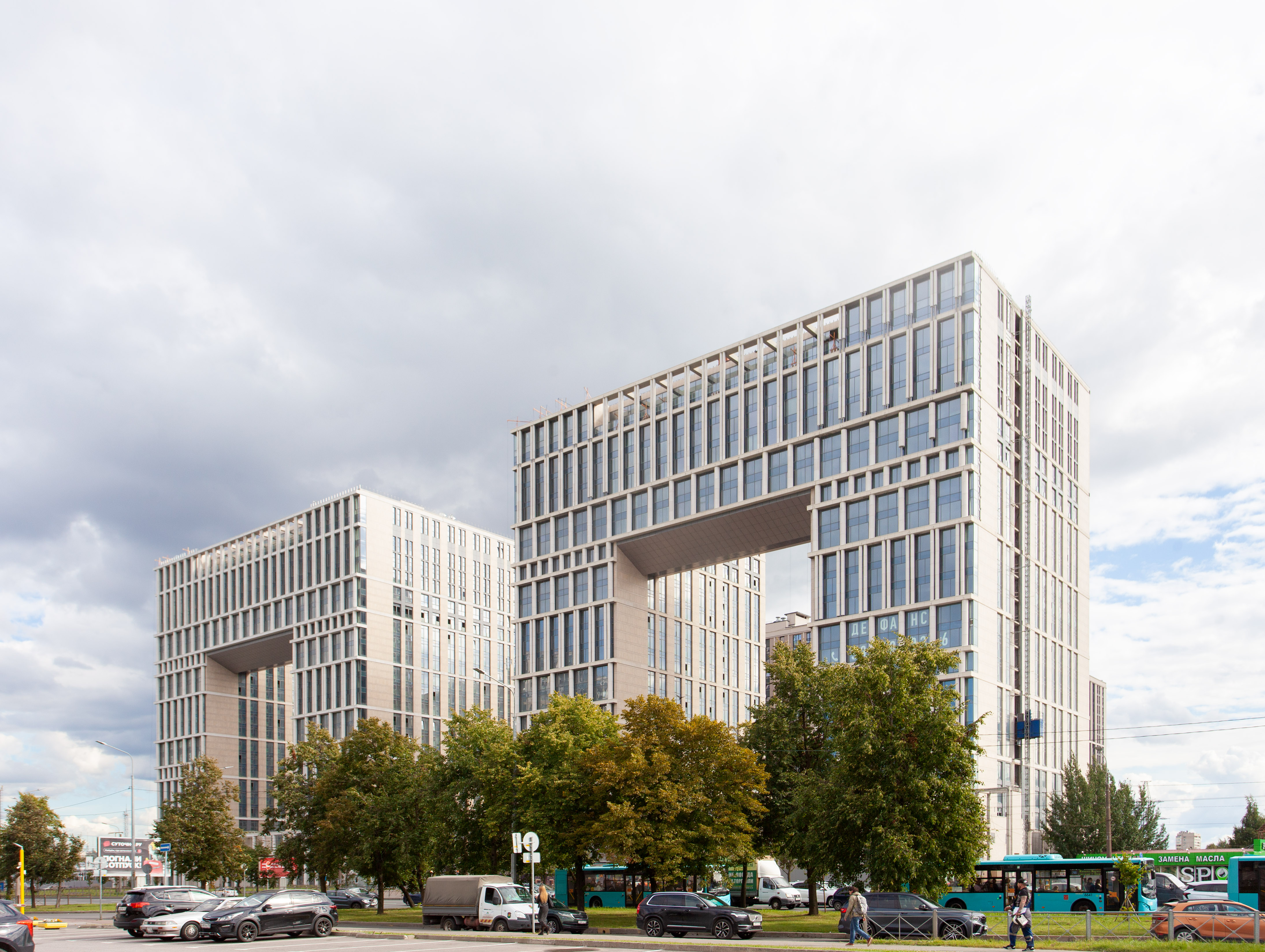 ЖК «Дефанс Премиум» — завораживающий проект авторской архитектуры в 10 минутах ходьбы от станции метро «Московская». Дом выполнен в виде двух 23‐х этажных арок, основания которых объединены единым внутренним пространством с большой парадной лестницей, променадом и каскадным фонтаном.