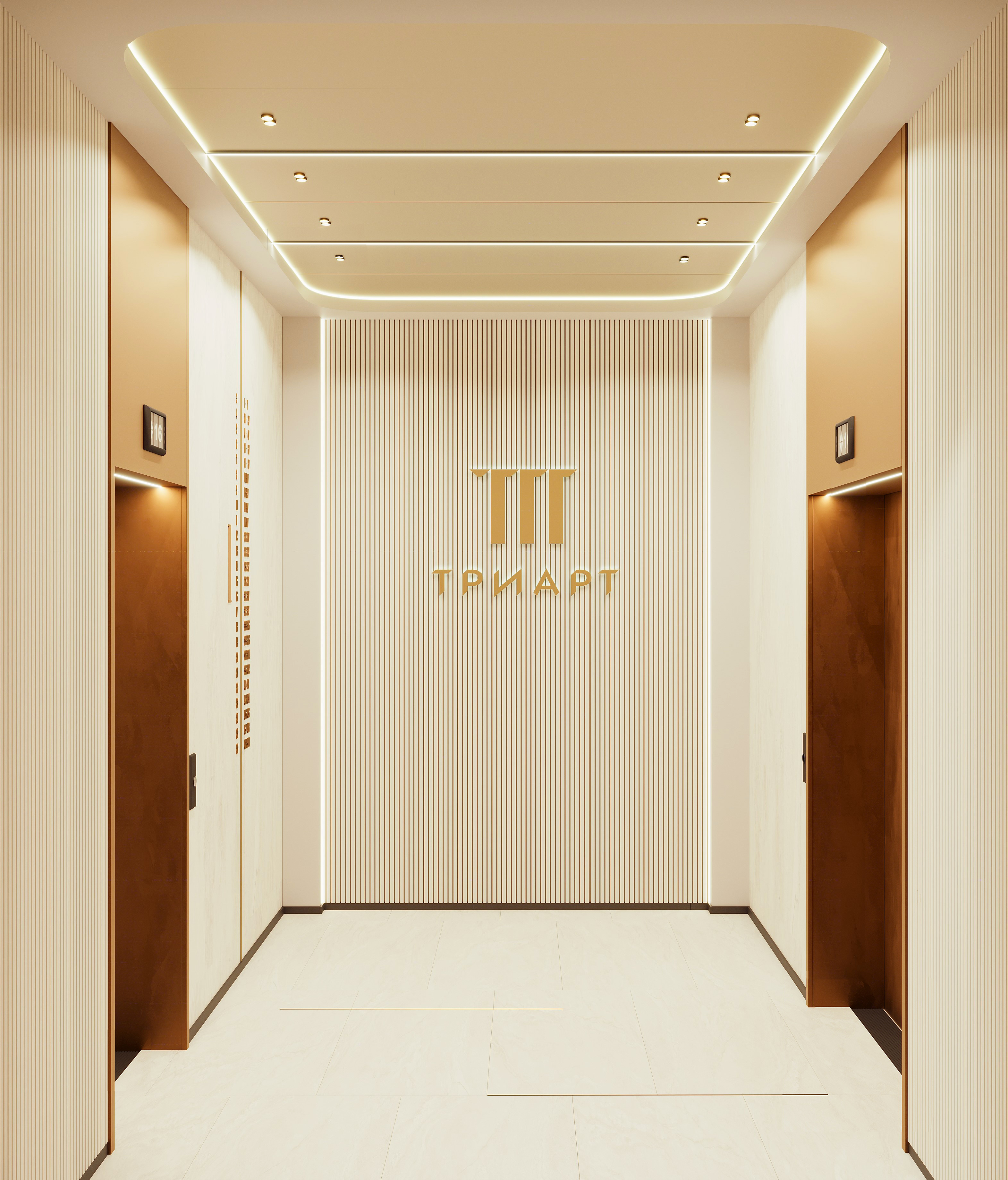 Вентилируемые фасады корпусов будут выполнены в современной монохромной светлой гамме. Дополнительную выразительность им придадут навесные декоративные элементы и козырьки балконов «под медь». Завершающим штрихом, который выделит «ТРИАРТ Резиденс» на фоне городской застройки, станет художественная подсветка, изящно подчеркивающая его эксклюзивную архитектуру.
