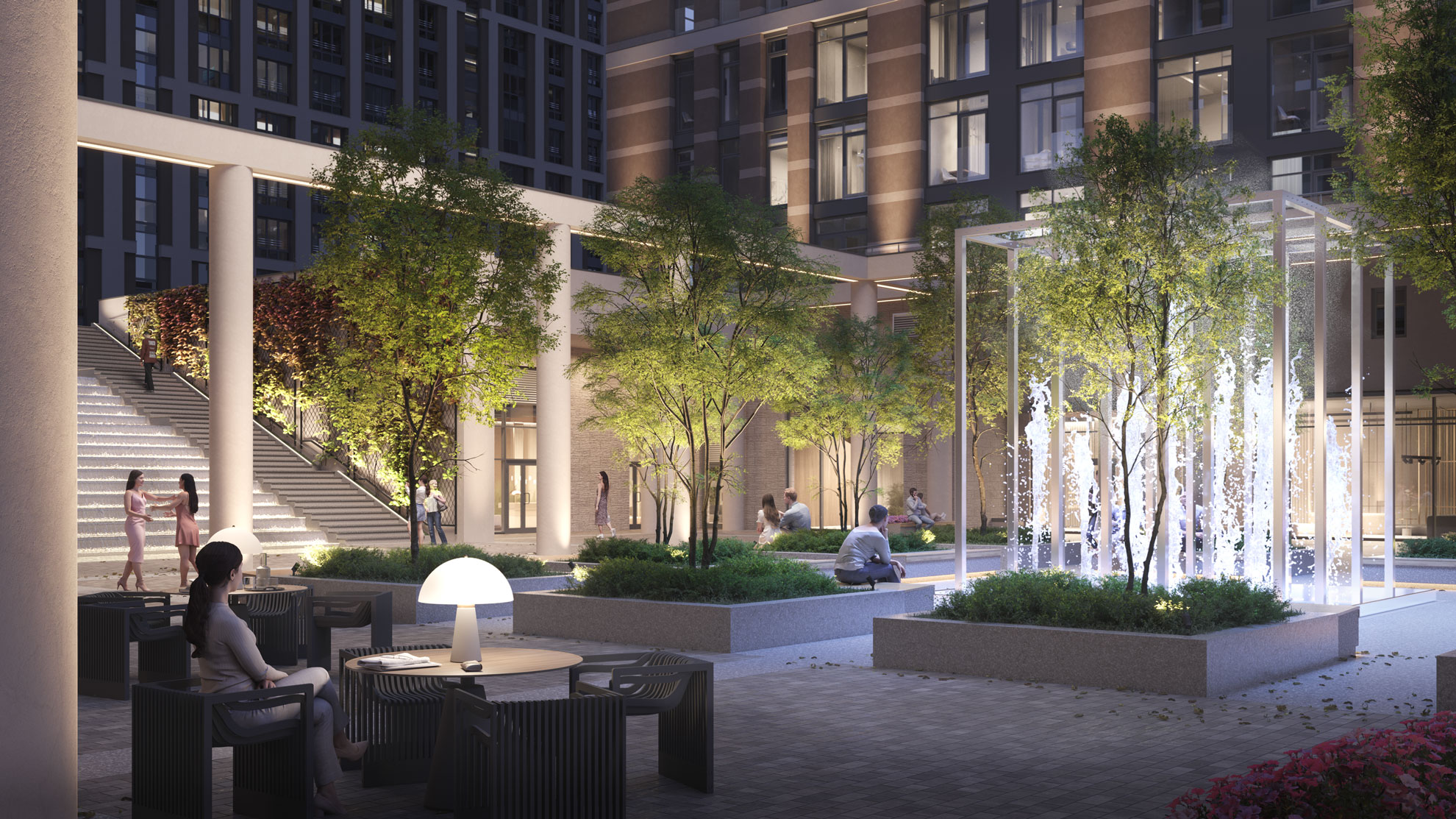 Дворовые пространства этого проекта вымощены натуральным гранитом, а в ночное время территорию украшает художественная подсветка.