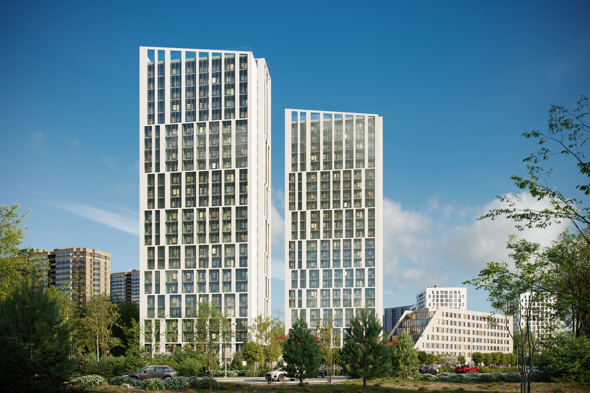 Наряду с семиэтажным корпусом, в составе жилого комплекса возводятся две 25-этажные башни, монолитные работы там идут на уровне 16-го этажа. Все три дома объединяет торговая галерея и приватный закрытый двор без машин.