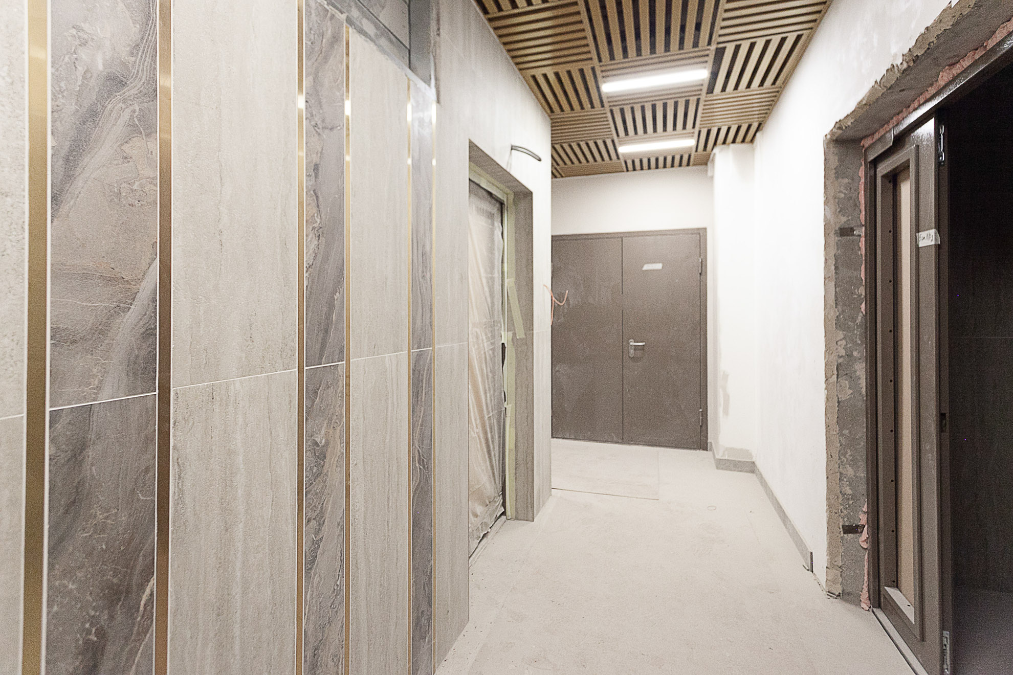 На всех типовых этажах продолжается отделка МОП: в работе в основном монтаж декоративных потолков и светильников.