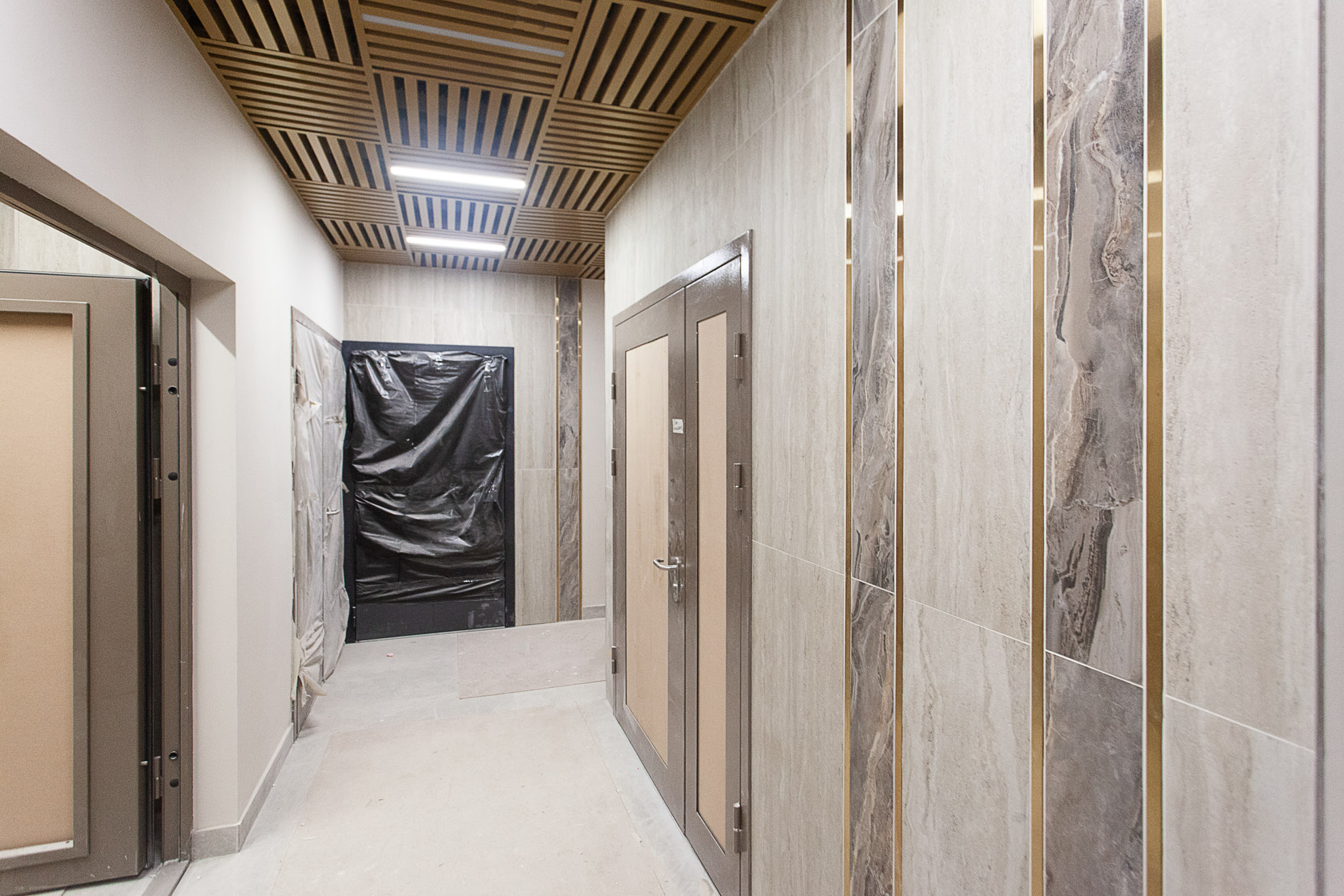 Среди основных направлений работ: чистовая отделка и устройство декоративных потолков входных групп 1-х этажей.