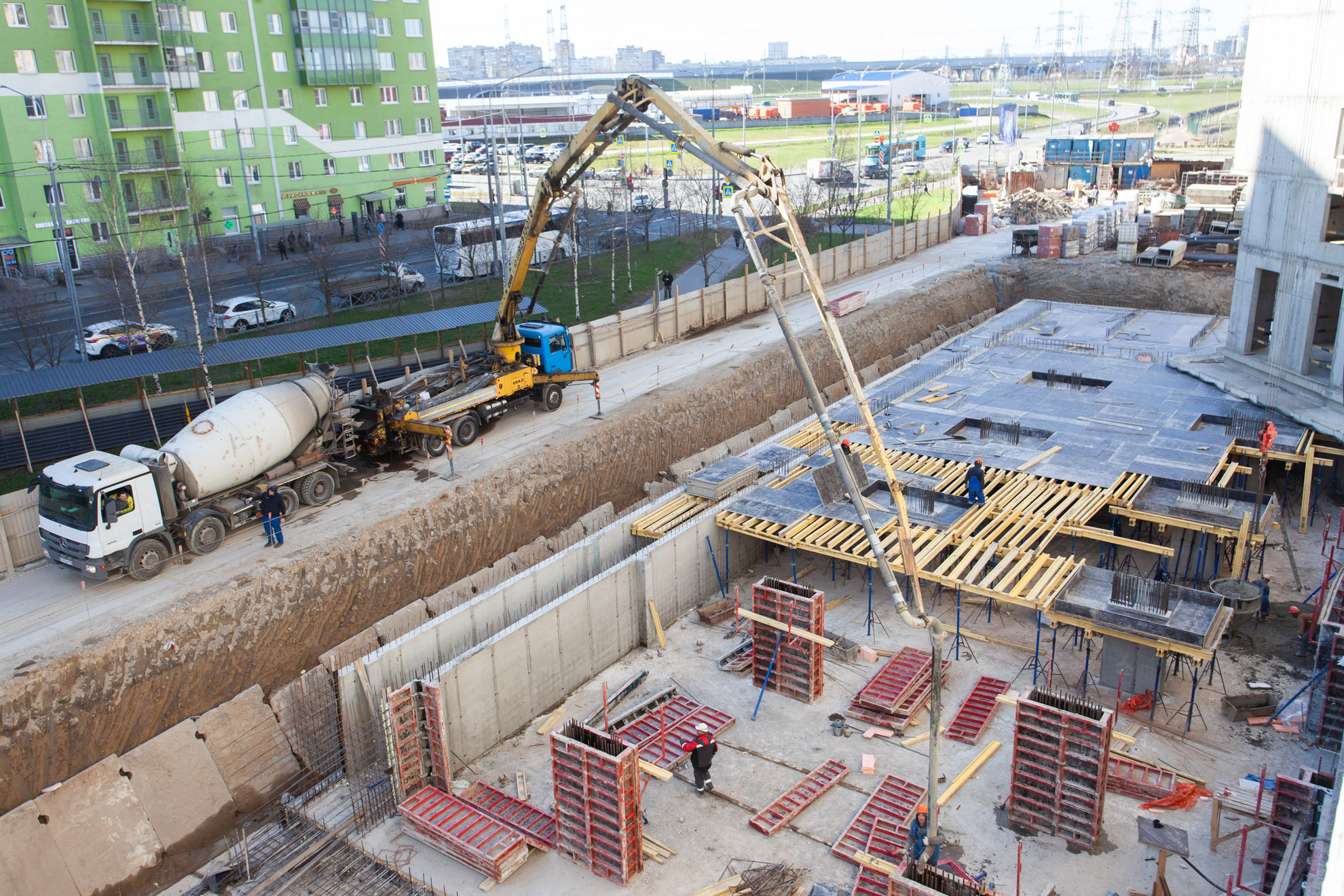Со стороны Муринской дороги продолжаются работы по подземному паркингу: первый этап завершен, по второму этапу выполнены пилоны, в работе опалубка плиты покрытия.