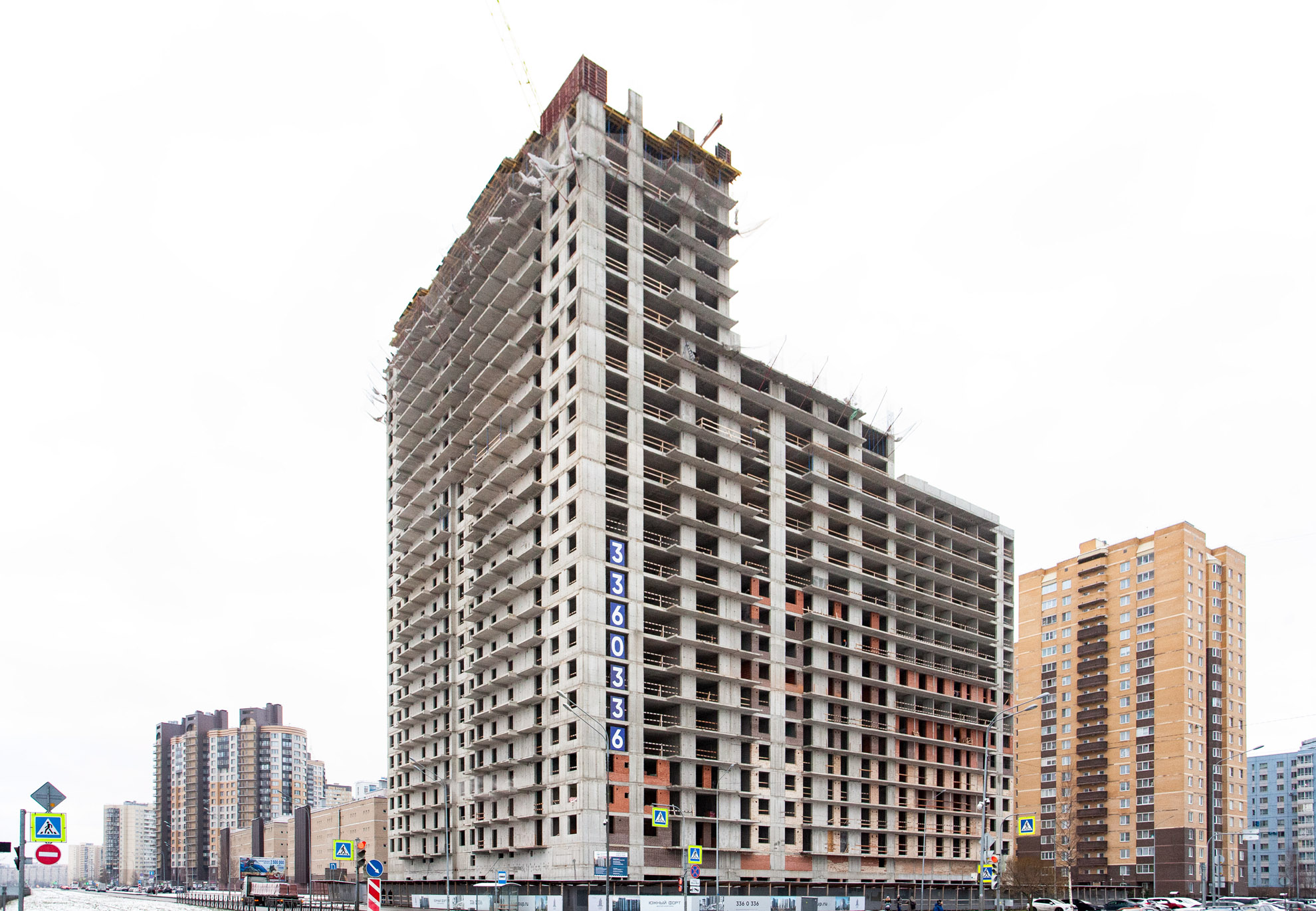 Основной объем монолитных работ выполнен. Во всех секциях также идет кладка наружных и внутренних стен. В первой секции выполнен основной объем с 1-го по 6-й и 8-й этажи. Во второй секции — с 1-го по 7-й этаж. Третья-пятая секции также в работе.