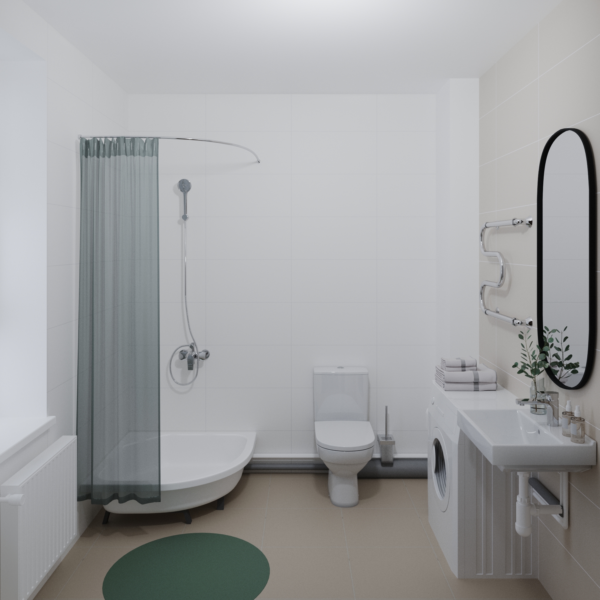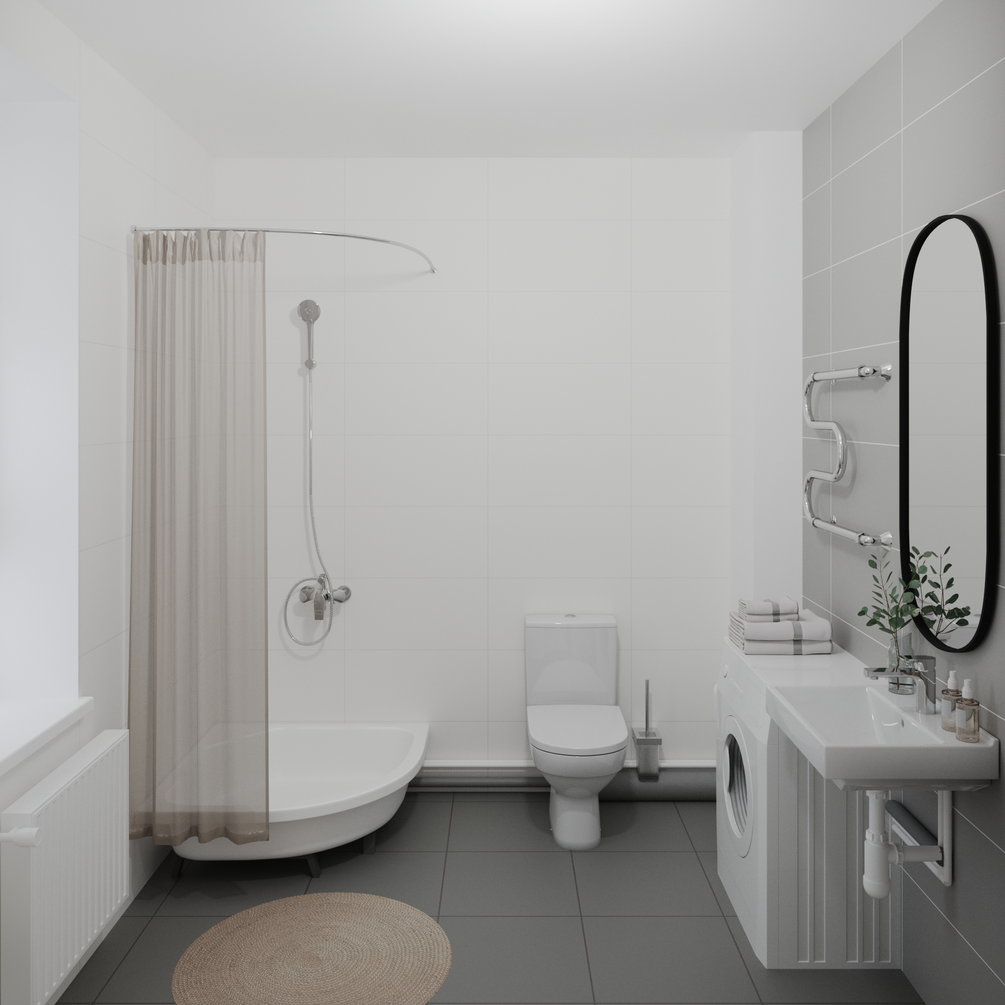 Установлена сантехника: ванна/душевой поддон, унитаз, раковина, смеситель, душ
